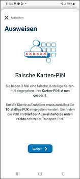 Beispiel AusweisApp: Nach dreimaliger Fehleingabe der PIN wird der Online-Ausweis gesperrt. Der Hinweistext der Fehlermeldung gibt Aufschluss darüber, warum der Ausweis gesperrt ist und wie er sich wieder entsperren lässt.